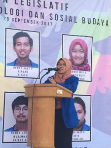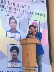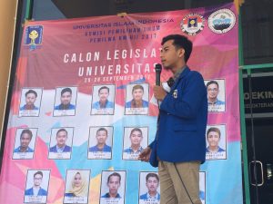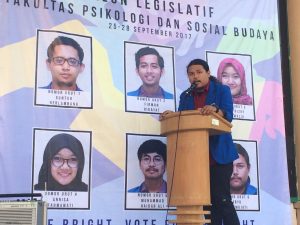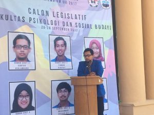 (Kampus Terpadu, Senin 18/09/2017) Endo Faisal Ad Dehlawi tersenyum di atas mimbar kampanye saat menyambut para Calon Legislatif Fakultas Psikologi dan Ilmu Sosial Budaya (FPSB) Universitas Islam Indonesia (UII). Ketika ditemui reporter LPM Kognisia, ia mengaku bahwa senyum yang dilontarkan sepanjang sambutannya itu karena dirinya merasa bahagia. Ia merasa bahagia lantaran estafet kepengurusan yang sempat diterpa berbagai isu karena hanya dua orang, akhirnya menemui titik cerah dengan adanya enam calon. Kebahagiaan kedua yang ia rasakan yaitu karena tanggung jawab yang dipangkunya sudah hampir usai. “Harapannya, apa yang disampaikan dalam kampanye bener-bener direalisasikan dalam perjalanannya nanti. Tidak kemudian pasif setelah menjabat di DPM, sehingga DPM dapat menjadi contoh yang baik bagi mahasiswa.” Tutup endo.