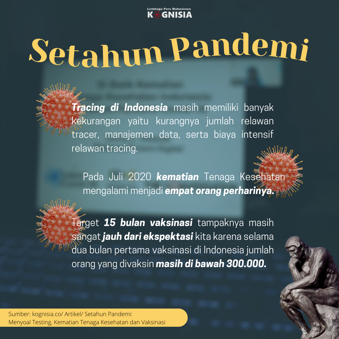 Jumat (12/3) The conversation Indonesia melakukan diskusi singkat dengan para ahli untuk Memperingati setahun Pandemi Covid-19 di Indonesia. Tepat pada tanggal 2 maret 2020 lalu kasus pertama virus corona terkonfirmasi di Kota Depok, Jawa Barat. Diskusi ini membahas berbagai tindakan dan kebijakan pemerintah setahun belakangan. Beberapa pertanyaan pun muncul : Kenapa berbagai kebijakan pemerintah tidak efektif menangani kasus? Mengapa kematian tenaga medis terus terjadi? Apakah vaksinasi akan selesai dalam 15 bulan?