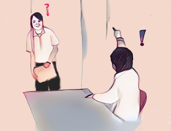 Pengajar                      : “Aduh, aduuh. Begini, kalau saya tidak diizinkan masuk kelas, siapa yang akan mengajarkan kalian? Siapa yang akan mendidik kalian menjadi generasi emas untuk bangsa ini? Siapa yang akan menyalurkan bekal ilmu kepada kalian sebagai pewaris bangsa ini?”